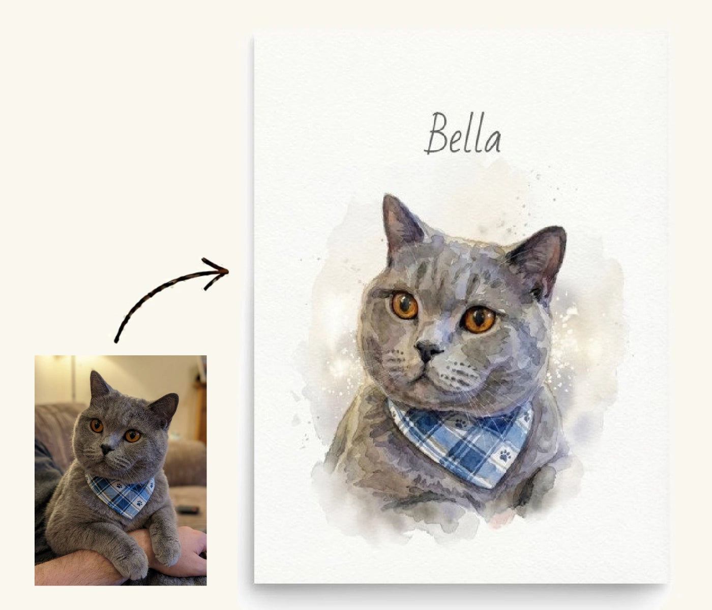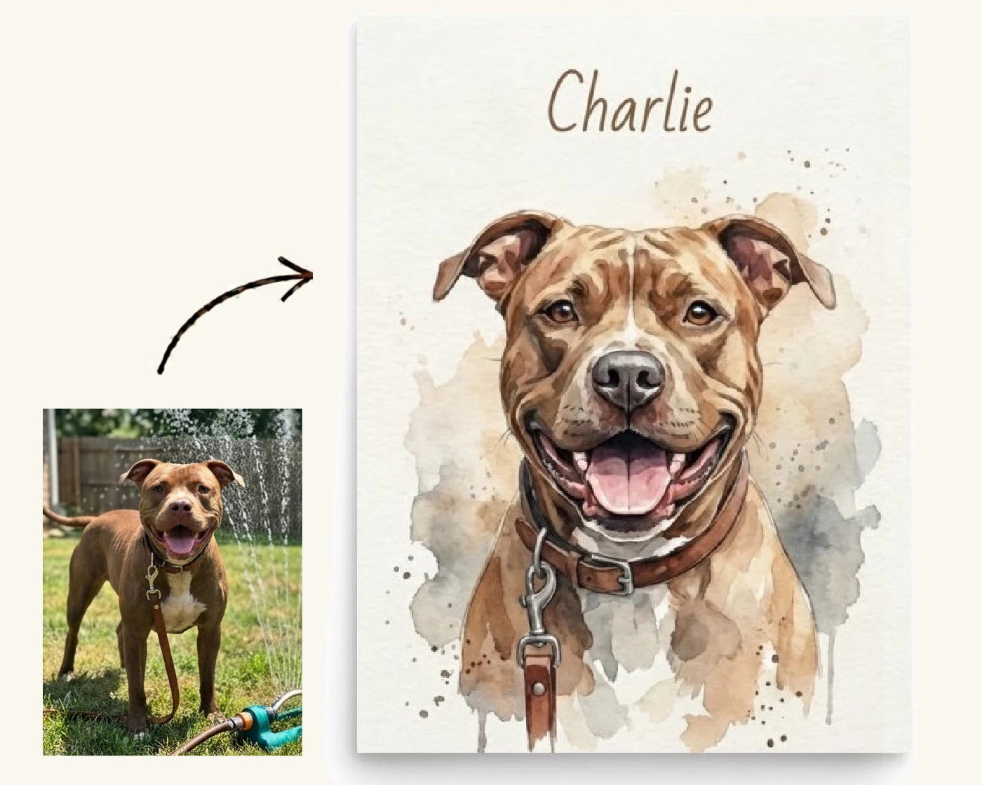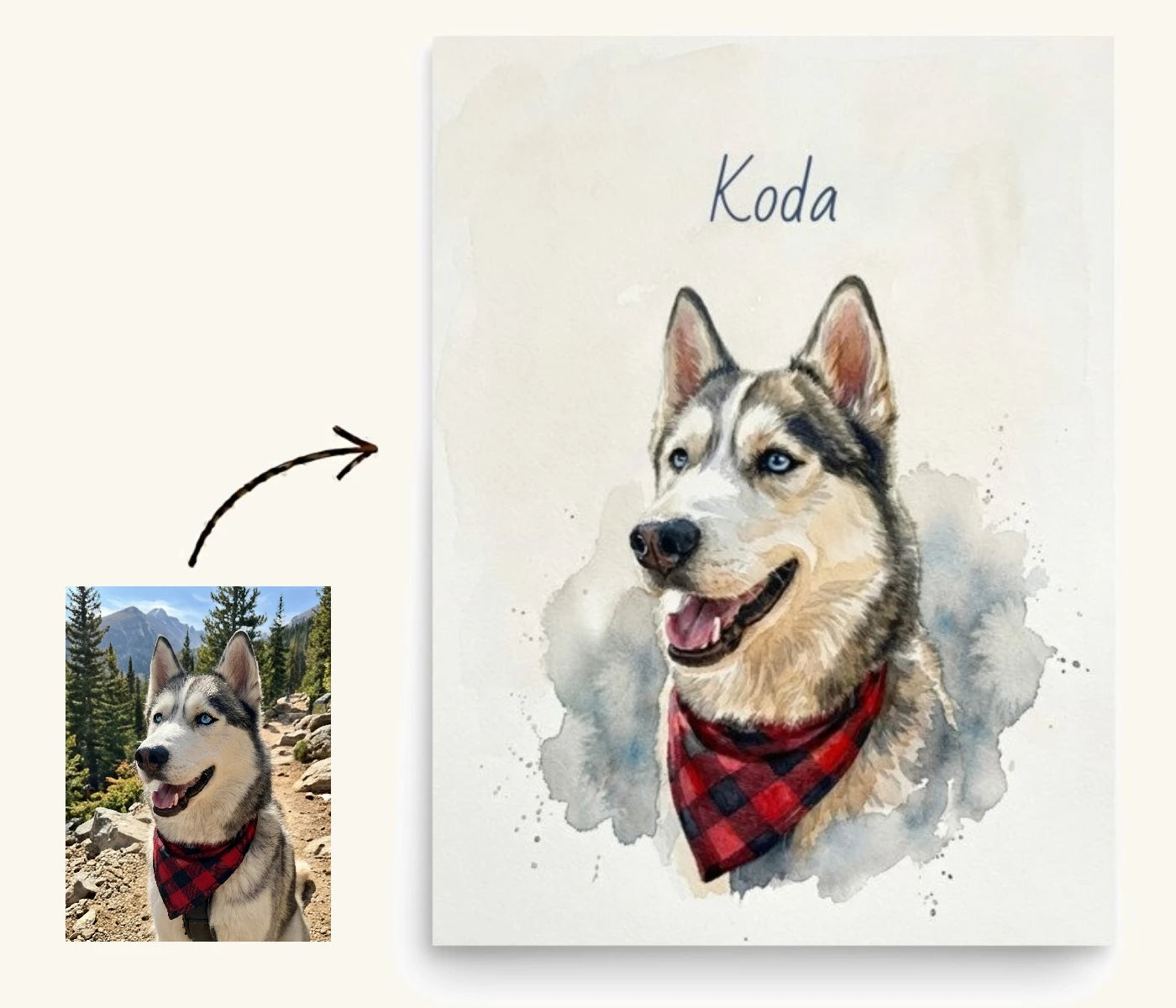 A made for you portrait based on your pet’s photo. The artwork keeps the natural look of your pet while adding our signature watercolor style. A lovely keepsake for yourself or a gift for someone special.