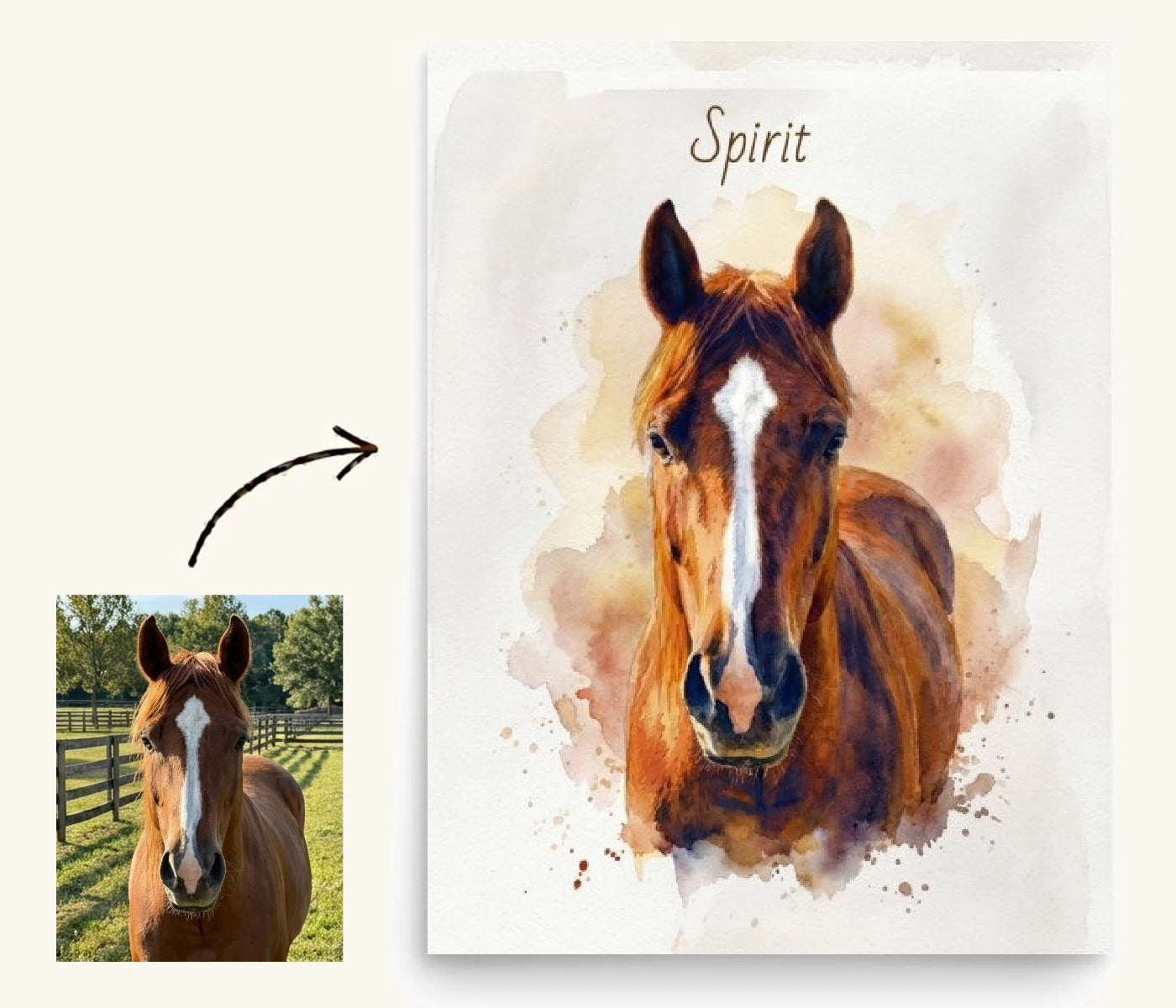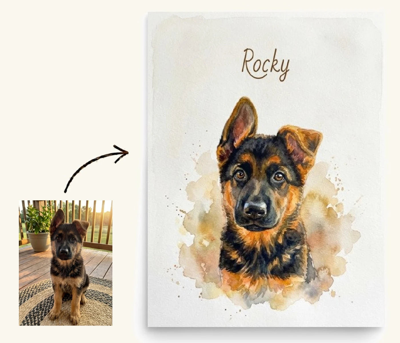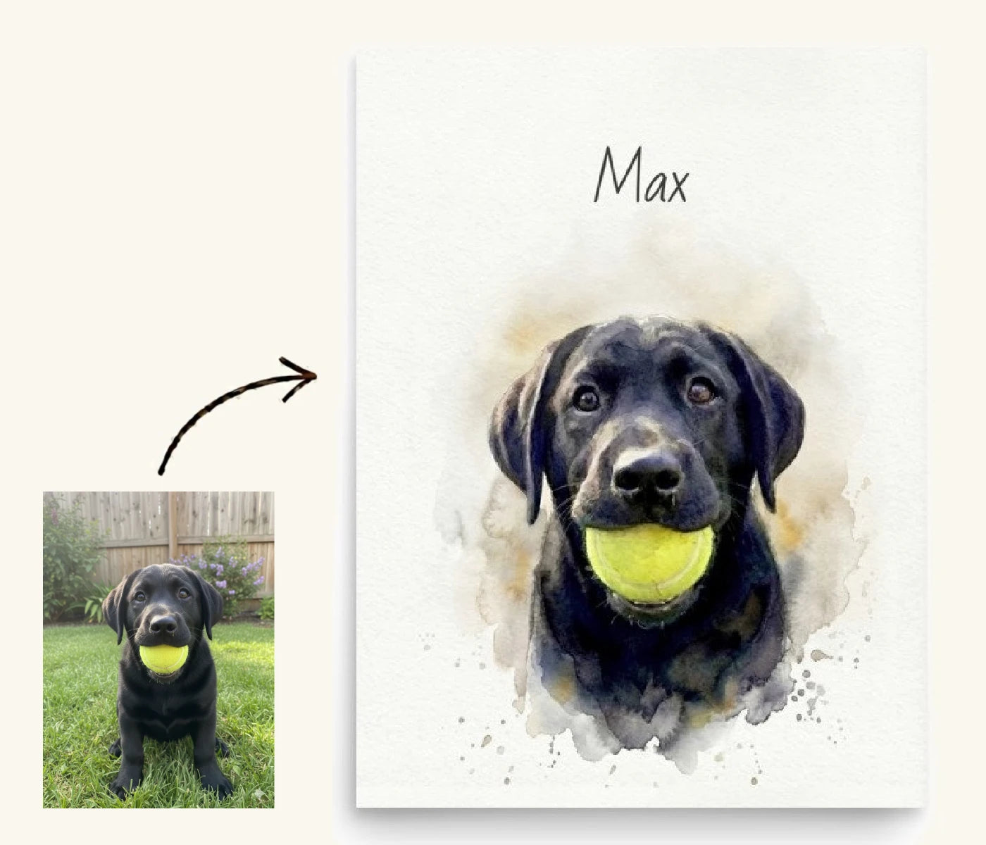 A made for you portrait based on your pet’s photo. The artwork keeps the natural look of your pet while adding our signature watercolor style. A lovely keepsake for yourself or a gift for someone special.